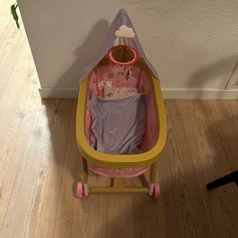 Baby Born lekesett som inkluderer badekar, stellebord og vugge. Settet har rosa og hvite farger og er laget av plastmateriale. Passer for barn som ønsker å leke med dukker og simulere stell og bading.