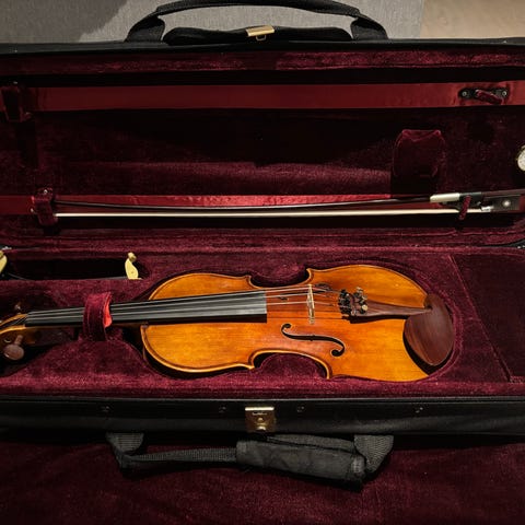 Lettspilt og vakker fiolin med flott tone og bærende klang. Utmerket håndverk. Et instrument for viderekomne. Svært pent behandlet. I meget god stand, med kvalitetsstrenger. Godt brukt kasse medfølger. Selges uten bue.