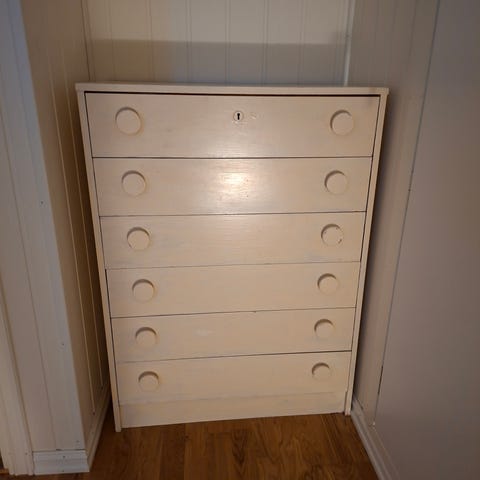 Kommode gis bort. Litt dårlige skinner i nederste skuff. Fungerer.