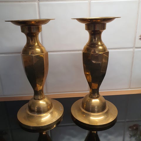 Selger to vakre lysskjold i tykk, tung messing. Høyde 25 cm / bredde 16 cm / dybde fra vegg 8 cm.