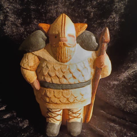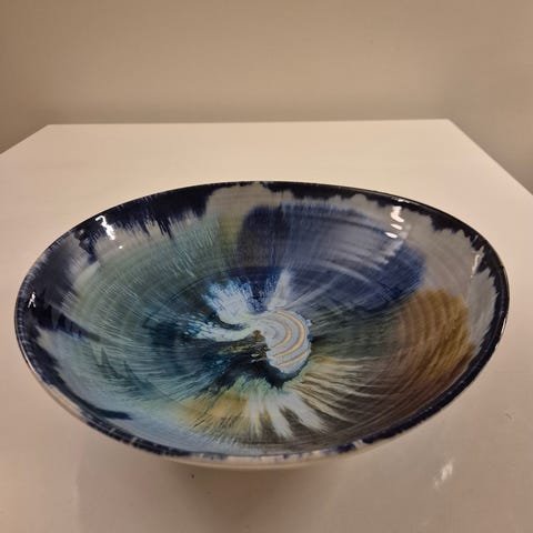 håndlaget keramikkrus med en blank glasur, primært i brunfarger med uregelmessige blå flekker. Kruset har et robust, rustikk utseende, noe som er typisk for mange unike, håndlagde keramikkprodukter. H:ca 12cm/D: ca 7cm.