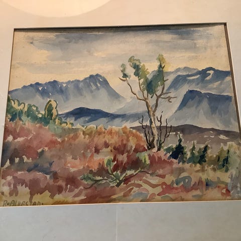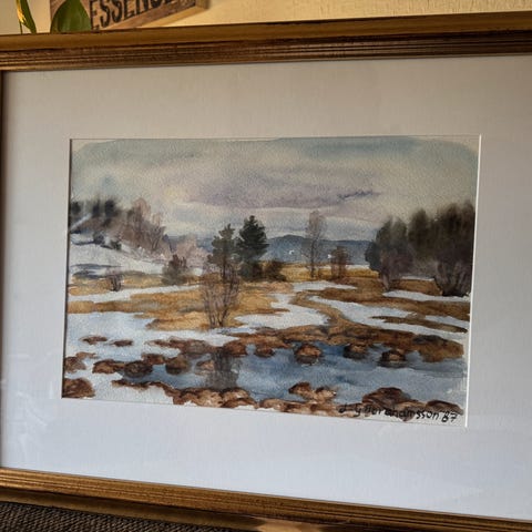 2 malerier av vinterlandskap i akvarell, innrammet med hvit passepartout og tynn treramme. Motivet viser snødekte trær og et vinterlig landskap med is og vann.