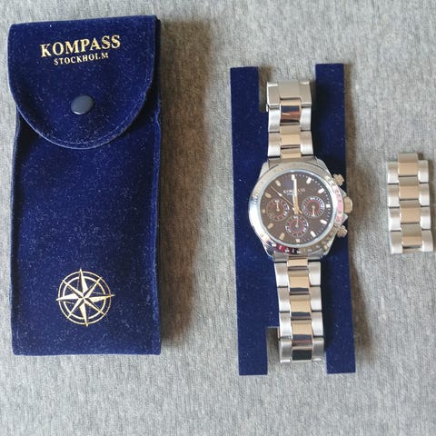 Kompass Stockholm Herreklokke med svart urskive, dato, og roterende bezel. Klokken har en kasse i rustfritt stål med en diameter på 40 mm og lenke i stål. Passer for menn.