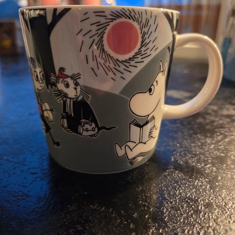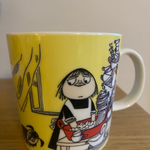 Arabia Mummitrollet kopp med gul bakgrunn og motiv fra Mummitrollet-serien. Laget i keramikk, egnet for daglig bruk.