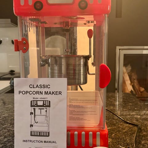Rubicon Popcorn Maker med en effekt på 1200 watt. Designet for å lage popcorn raskt og enkelt uten behov for olje. Egnet for bruk hjemme.