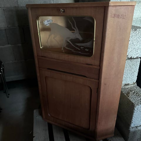 Den er støvete men i fin stand - den er blitt veldig støvete både ute og inne, men den er faktisk veldig fin på overflaten generelt - se bildene der jeg har tatt bort litt av støvet på overflatene i og utenfor skapet.
