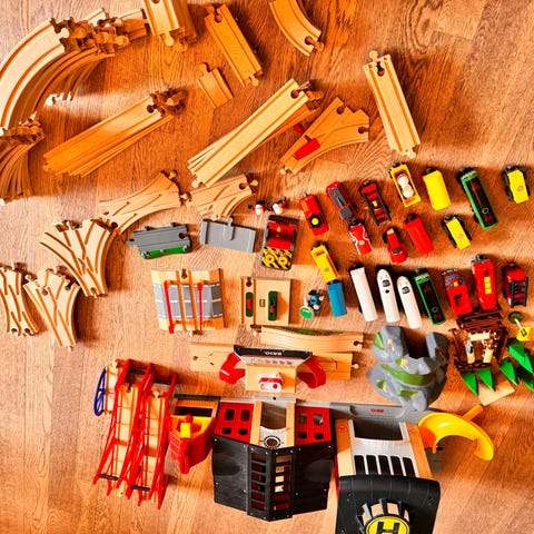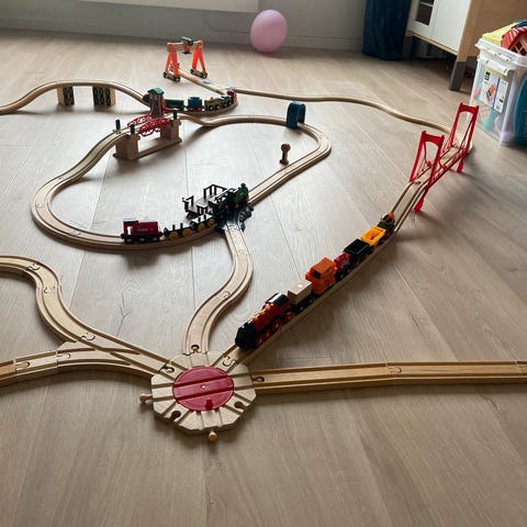Pent brukt stor Brio sett. Masse deler, inkludert elektrisk tog fra IKEA og nye Brio biler: politi, brannbiler, ambulanse (med lys og lyd), gravemaskin og gaffeltruck. Heis, skip, ferje kraner er veldig gøy å leke også. Alt fungerer helt fint :)