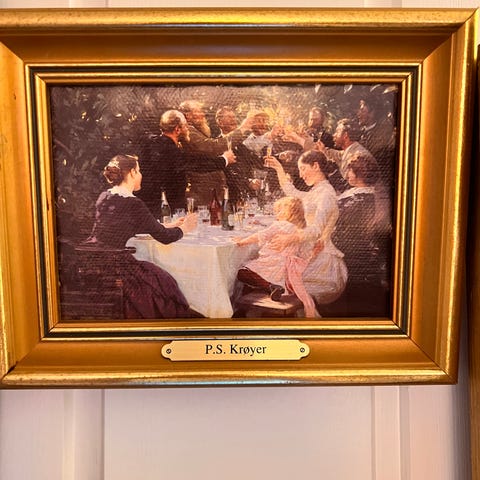 Trykte bilder av kunstneren Leif Eriksen i rammer. Fem innrammede trykte tegninger