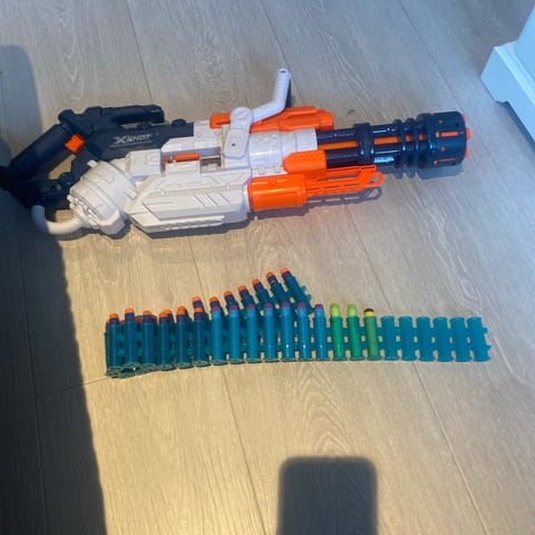 Nesten ikke brukt, men kulene er ikke lenger trill runde fordi de har blitt lagret oppi en stor lekekasse. Batteriet har gått.