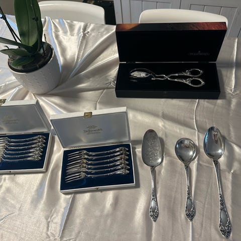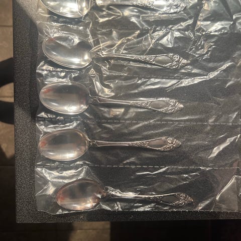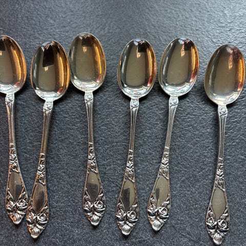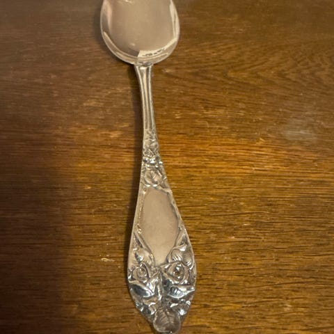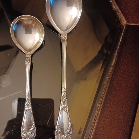 6 stk opphøyd Rose Spiseskjeer selges til kr 800 kr pr stk pluss porto, Må nok pusses siden dem har ligge nedpakket ei stund