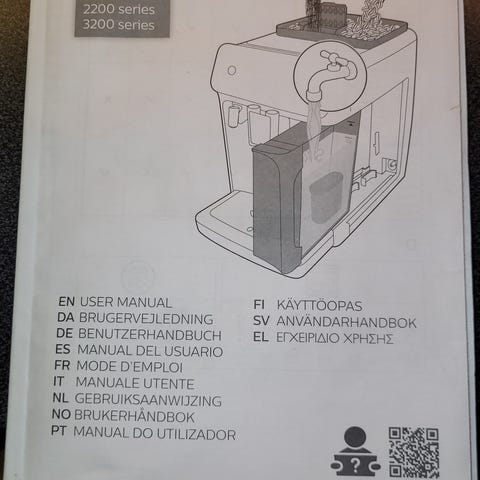 Philips Series 2200 kaffemaskin i svart farge. Maskinen har et kontrollpanel med knapper for ulike kaffevalg og en melkeskummer på siden. Passer for hjemmebruk og lager ulike kaffedrikker.