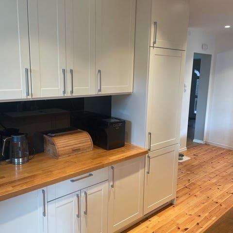 Selges samlet. Hvitevarer kan fåes med (har oppvaskmaskin, ventilator og ovn- kopling er klippet), trenger rens. Platetopp funker ikke. Blandebatteri med oppvaskskum, siste nevnt med bulk ved demontering så bør kjøpe ny . Demontert og klar forhenting. 3 av overskapene med løs håndtak. Skapene er nesten nye innvendig! Ingen skader i skapene utvendig..