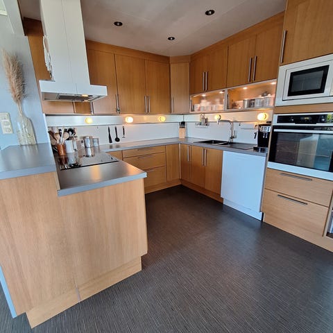 Komplett. 10 år gammel. Kompositt benkeplate. Overskapene av høyglans, underskapene av finert eik. Mål er 3,6 m x 1,3 m.