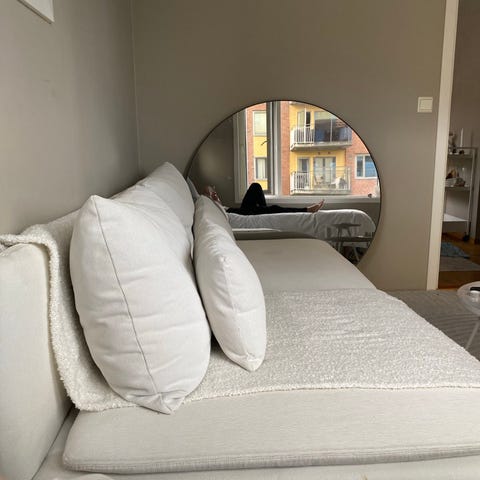 IKEA kvadratisk speil med hvit ramme. Speilet har en sprekk i hjørnet, som vist på bildene. Egnet for veggmontering.