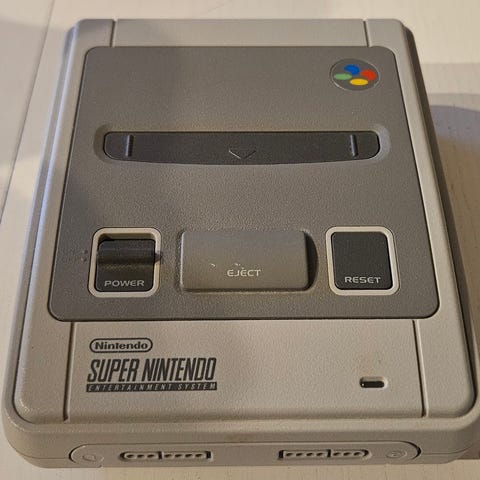 Nintendo Super Nintendo mini retro spillkonsoll med tilhørende to kontrollere og 20 spill. Konsollen har standard design og farger for Super Nintendo, med grå base og fargekodede knapper på kontrollerne. Produktet har 2 kontrollere.