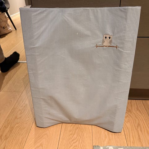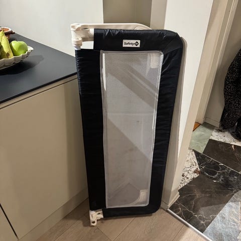 Det ene hengslet er litt ødelagt, men det gjør bare at den kan henge litt "innover" mot sengen. Utover mot gulvet virker den fortsatt, men følg litt ekstra godt med for sikkerhets skyld.