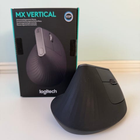 Logitech MX Vertical , ergonomisk designet datamus for redusert belastning på håndledd og underarm. Produktet har vertikal utforming for naturlig håndposisjon og forbedret komfort ved langvarig bruk.