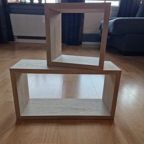2 av hyllene er bokser og resten er hyller. Har også ekstra pinner i en pose som du får med om du ønsker alt. Du får alt for 600 totalt om du henter alle snarest. Bare hyllene i seg selv var 150kr per stk så jeg selger det veldig billig. Cube hyllene som det er 2 av kostet 250. 4 svarte oppbevaring bokser kan også følge med som jeg har brukt på bunnen. Se siste bilde.