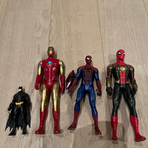 Spiderman actionfigurer sett bestående av fire figurer, inkludert karakterer som Spiderman, Nightwing, Robin og en annen figur med oransje og svart drakt. Figurenes høyde er ca 30cm, og de er laget i plastmateriale. Passer for barn og samlere. DC comics.