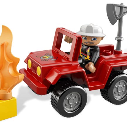 Lego Duplo sett 4977 - Brannbil - selges. Settet er pent brukt og selvsagt helt komplett, de eneste avvikene fra delelisten er at en av brannmennene har hvit hjem i stedet for sølvfarget hjelm, og at en av de to brannslangene er grønn isteden for sort. Men dette begrenser neppe leken. Stor og veldig kul brannbil med stige og alt som hører til.