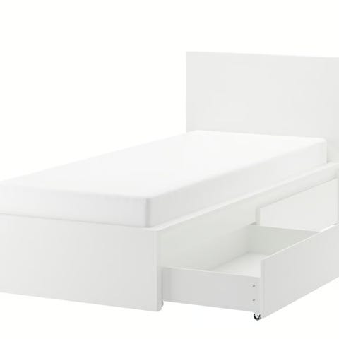 En høyseng som har blitt brukt av ett barn. Det er med kombinasjon av pult og klesskap, hyller og skuffer.