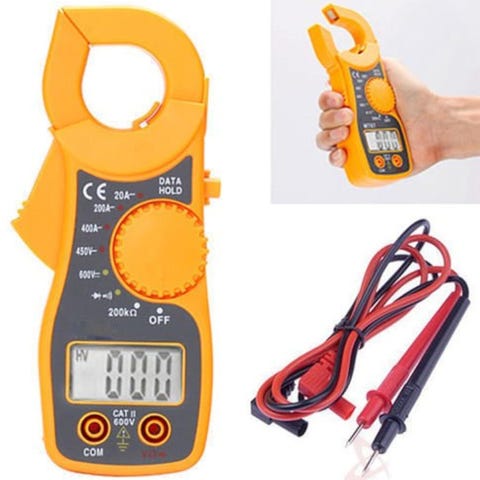 Pent brukt Tangamperemeter uni-t UT203, kjøpt på clas ohlson. Det er et kategori 2 instrument, og måler Ampere, Volt og Ohm.