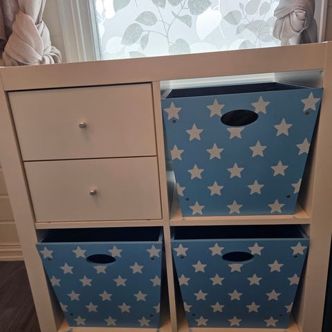 IKEA Expedit Kallax 4x4 hylle til salgs. De 5 grå kurvene følger med. Brukt og har noen bruksmerker.