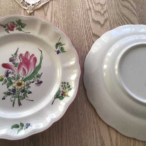 Tallerknene er fra 1900 tallet og er i perfekt stand, og selges parvis. De er 24 cm tverrmål og laget hos hederskronte Keller & Guerrin, og er Luneville Old Strasbourg serien. Det ene paret er i mellom gul farge, det andre er hvitt og med samme nydelig håndmalte blomster motivet. Det gule paret selges for kr. 1.200 og det hvite for kr 1.900.