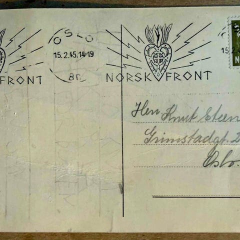 WWII motiv som viser symbolikk knyttet til geografiske områder som USA, Canada, Tyskland og Europa. Postkortet har plass til adresse og melding på baksiden.