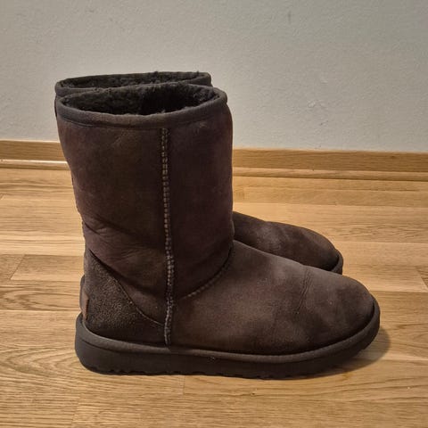 UGG W Classic Short II støvler i svart farge, størrelse 38. Laget i mykt materiale med solid såle, designet for komfort og varme.Strenger bre et svart spray for å ses it som helt nye. 100% ekte UGG kjøpt på Ferner Jakobsen på 2450kr . Brukt en del av vintersesongen .Selges billig da har jeg mange UGG modeller.