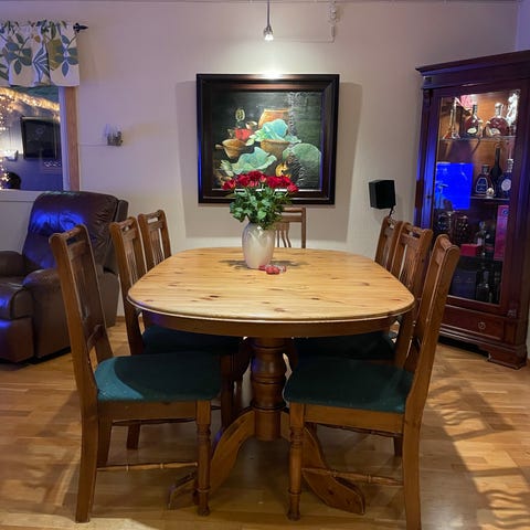 Spisebord fra Bohus selges. Har noe bruksmerker, se bilder. Innlegggsplate er 45 cm bred, to stykk medfølger. Bredde på bordet uten innleggsplater er 160 cm.