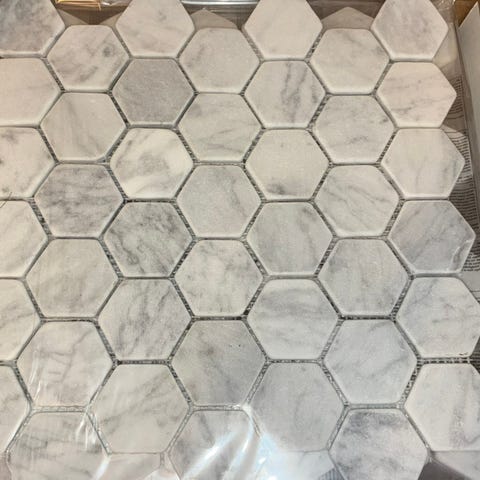 Nydelige mosaikkfliser fra Ulfven. Traverine marmor (natursten). 2 uåpnede pakker med hver 5 stk (0,45 kvm pr eske). Totalt 0,9 kvm.