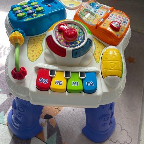 Pent brukt aktivitetsbord til baby selges. Beina kan tas av slik at baby kan leke med den liggende på magen. Etter hvert som barnet klarer å stå er bordet gøy å trykke på stående. Med lyder og tlf som kan tas av. To lydnivåer.