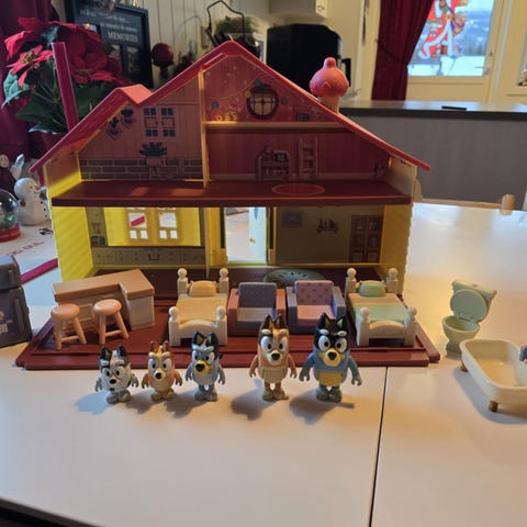 Bluey barnleker figurer. Sett med flere karakterfigurer fra Bluey-serien, Venner og bestemor bluey og bingo