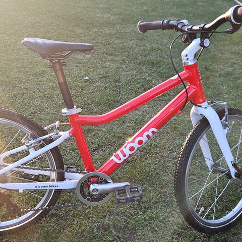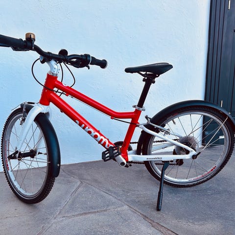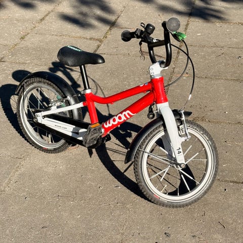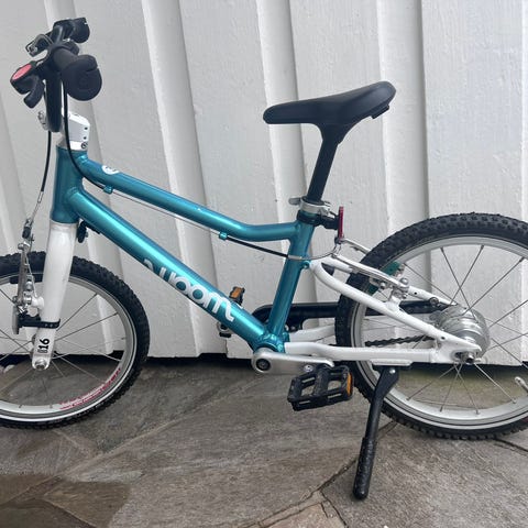 Passer for barn, utstyrt med håndbremser og en komfortabel sadel samt støtte. Sykkelen har solide dekk og en lett ramme for enkel håndtering.