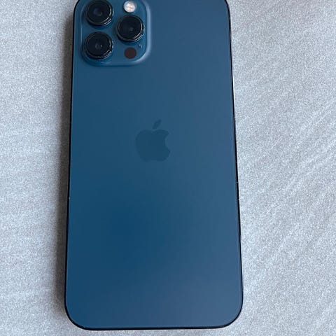 Strøken Apple iPhone 12 Pro mobiltelefon med 128 GB lagringskapasitet til salgs. Telefonen har et kamerasystem med flere linser og en farge i blåtoner. (Stillehavsblå)