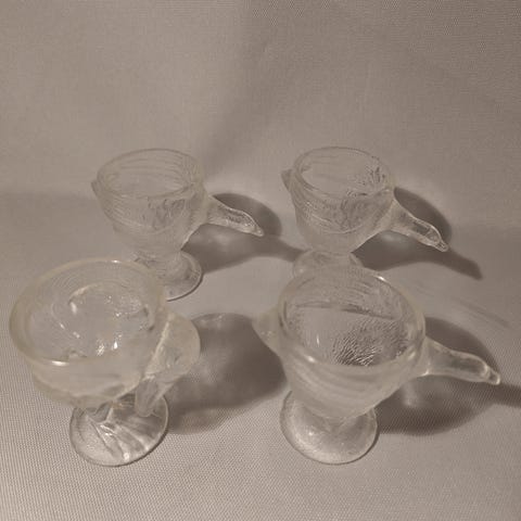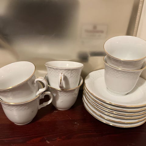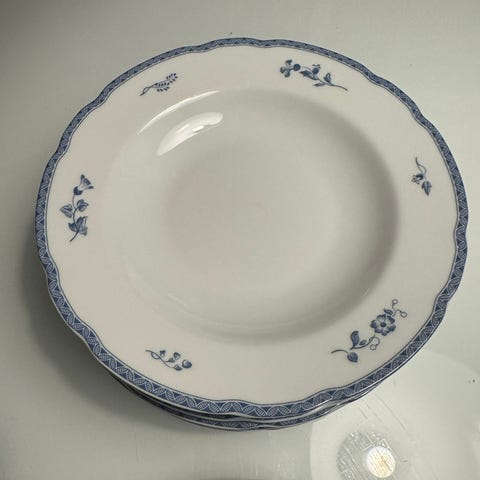 Jeg selger to pene asjetter fra finske Arabia. De er i hvitt porselen med blå blomster langs kanten og gullkant. Kanten har en bølgete form.
