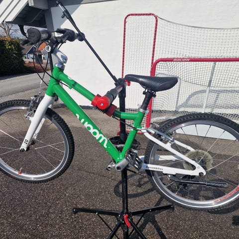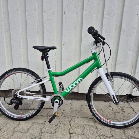 Woom 3 barnesykkel i rød og hvit farge. Sykkelen har et rammedesign tilpasset barn, med størrelse egnet for yngre syklister. Den har håndbremser og pedaler tilpasset barn samt støtte. Materialet er lett og robust, egnet for barnets bruk.