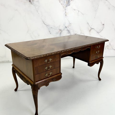 Chesterfield kontorstol i mørkebrunt tre og burgunder skinn. Stolsete har høyde 48 cm, mens stolrygg er 83 cm høy.