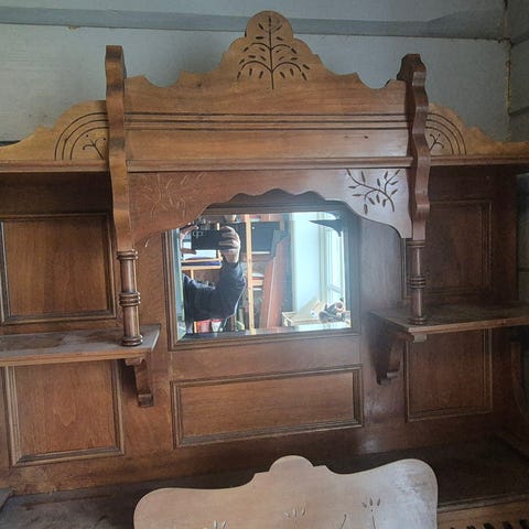 Antikk kommode i tre med fire skuffer. Kommoden har utskårne detaljer og en overflate med slitasje og merker. Passer til oppbevaring i hjem eller kontor.