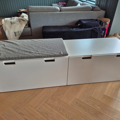Hvit IKEA Stuva benk med oppbevaringsskuff. Egnet for oppbevaring av leker og annet barneutstyr.