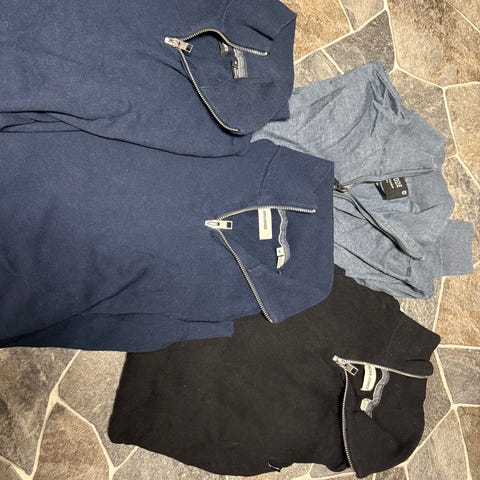 Genserpakke fra Jack & Jones selges. 3 tynne gensere som er brukt, men fortsatt meget fine! Selges rimelig samlet. To blå i 100 % bomull og én grå i akrylmix.