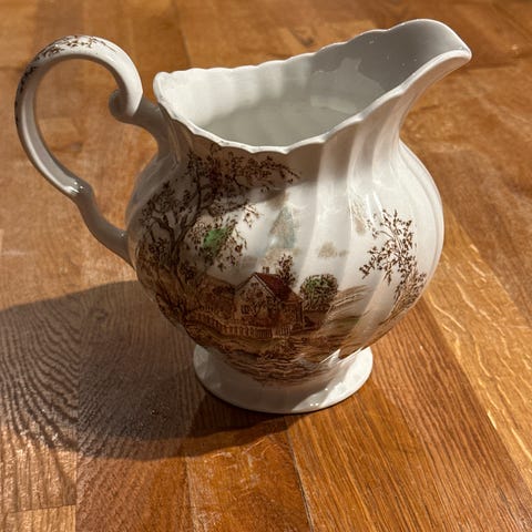 Myott The Brook sukker og melk i porselen med dekorative landskapsmotiver. Begge deler har et klassisk design og er laget i England, Staffordshire Ware.