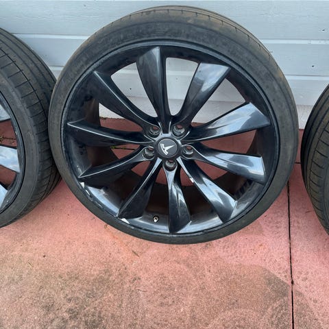 Selger 21" Arachnid felger med godt brukte sommerdekk. Orginale fra Tesla. Michelin. Kan holde en sesong til. Felgene er ok. Kun en liten kantskade på en felg. Felgene er sprayet med svart matt plastidip som lar seg lett fjerne.