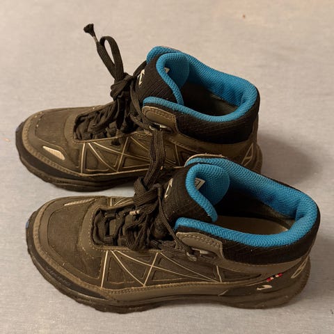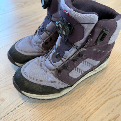 Viking barnesko størrelse 36, unisex. Skoene er blå og laget for barn. De har borrelåsfester for enkel justering og god passform. Sålen har et mønster som gir godt grep, egnet for utendørs bruk.