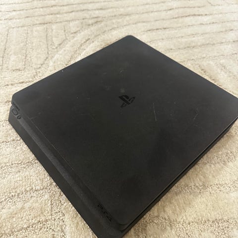 PlayStation 4 spillkonsoll med inkluderte spill: Just Dance 2020, The Walking Dead, Fifa 15. Medfølgende rød kontroller og PlayStation kamera.
