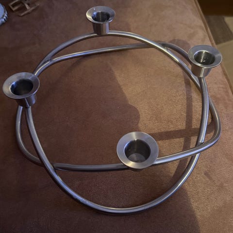 Georg Jensen lysestake med fire lysestakeholdere, laget i metall. Designet med sammenflettede ringer som gir et moderne og stilrent uttrykk.