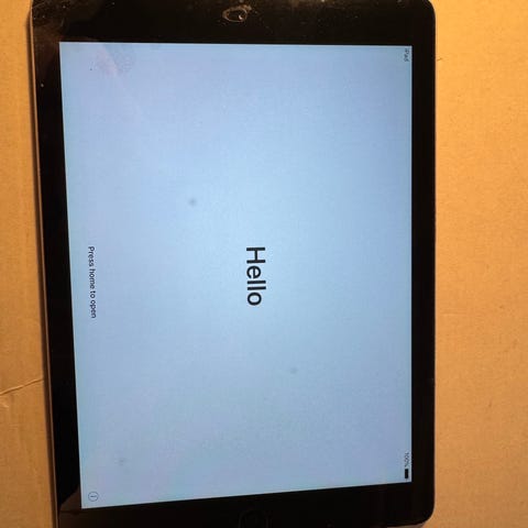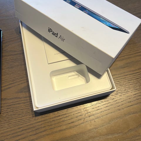 Apple iPad Air nettbrett. Modellen er A1474, første generasjon lansert i oktober/november 2013. Den har en 9,7 tommers Retina-skjerm med oppløsning på 2048 x 1536 piksler. Utstyrt med Apple A7 64-bit prosessor med M7-koprosessor.