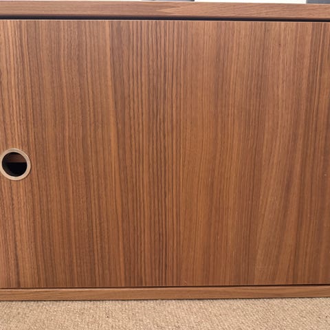 Har noen bruksmerker (se bildene), men ingenting som påvirker funksjonen. Skapdørene sklir fint. Alt er originalt fra String furniture. Stabilt og ryddig system som passer perfekt som TV-benk, entrémøbel eller i stue/kontor.