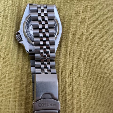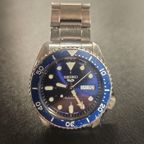 Seiko herreklokke med automatisk mekanisme. Klokken har en rund urskive med blå bakgrunn og markører for tid. Kassen er i rustfritt stål, og remmen er laget av svart lær. Klokken har en roterende bezel og viser dato. Diameter 41mm. Designet er robust og egnet for daglig bruk.